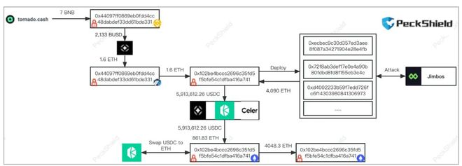 圖三為Jimbos協(xié)議,是基于Arbitrum的DeFi項(xiàng)目。近日,Jimbos協(xié)議遭遇閃電貸攻擊,損失4000 ETH,價(jià)值超750萬美元。