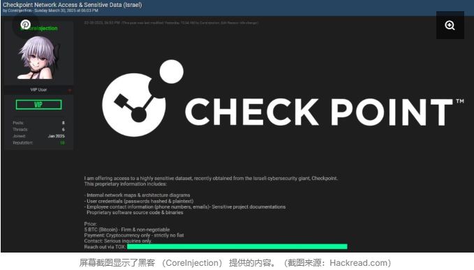 Part 1 網(wǎng)安巨頭Check Point公司被黑客入侵并兜售源代碼 近日,化名為CoreInjection的黑客宣稱入侵以色列網(wǎng)絡(luò)安全公司Check Point,竊取了包括內(nèi)部項目文檔、用戶憑證(含哈希及明文密碼)、