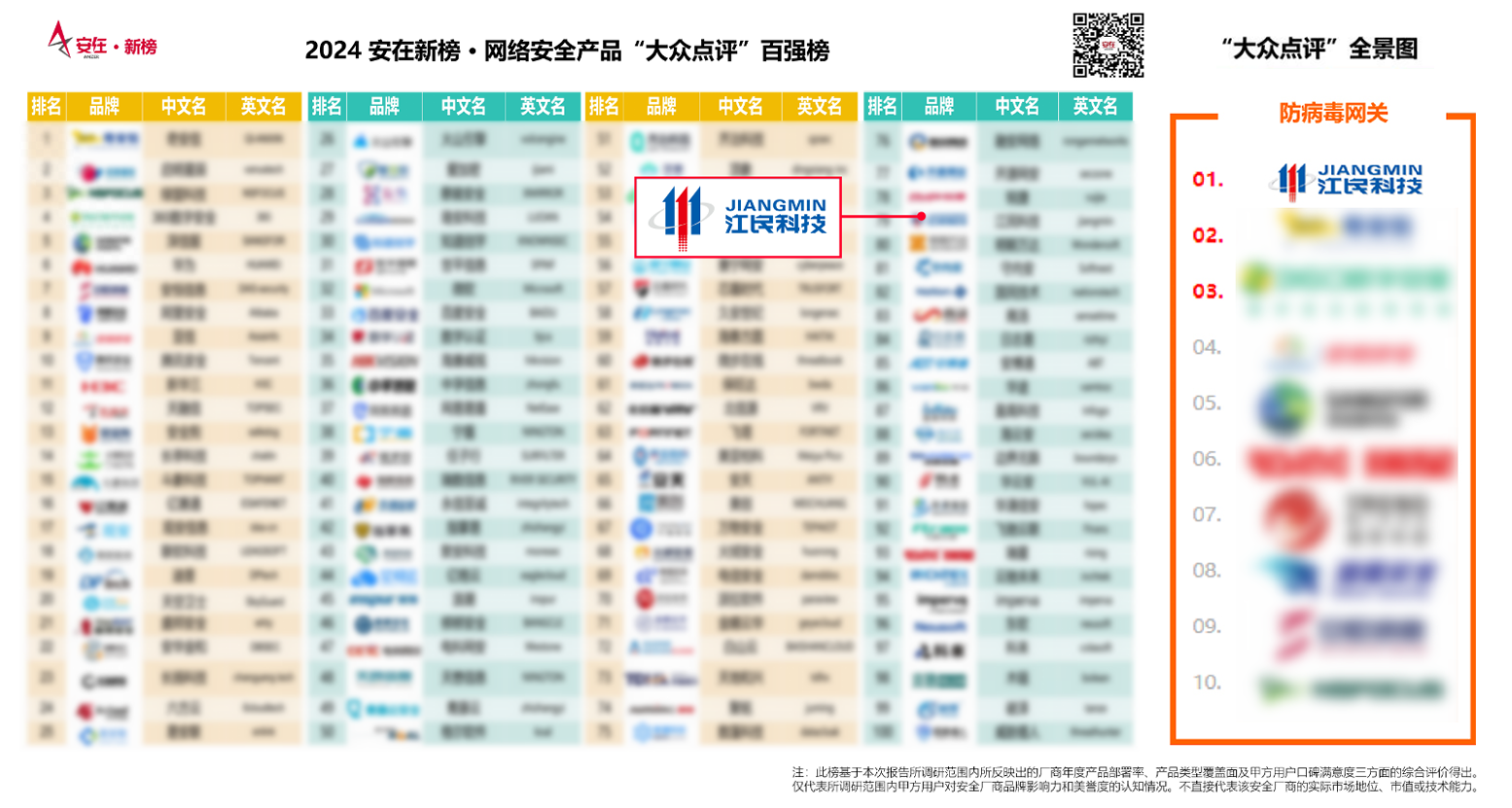 報(bào)告基于全景圖中網(wǎng)安廠商品牌的表現(xiàn),統(tǒng)計(jì)了本年度內(nèi)對(duì)甲方企業(yè)用戶影響力最強(qiáng)的中國(guó)市場(chǎng)網(wǎng)絡(luò)安全TOP100企業(yè),發(fā)布了《2024安在新榜網(wǎng)絡(luò)安全產(chǎn)品“大眾點(diǎn)評(píng)”百?gòu)?qiáng)榜》。江民科技憑借良好的口碑、品牌知名度、技術(shù)服務(wù)滿意度及市場(chǎng)占有率等綜合實(shí)力再度入選百?gòu)?qiáng)榜。同期,安在發(fā)布的《2024安在新榜網(wǎng)絡(luò)安全產(chǎn)品“大眾點(diǎn)評(píng)”全景圖》中,江民科技憑借在防病毒領(lǐng)域深厚的技術(shù)積累和產(chǎn)品實(shí)力位列防病毒網(wǎng)關(guān)第一名!