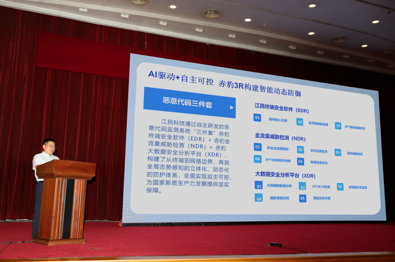針對這種情況,江民科技首創(chuàng)AI驅(qū)動的“動態(tài)防御+主動免疫”架構(gòu),依托億萬級威脅樣本庫構(gòu)建的AI檢測模型,打造了“赤豹3R”(EDR+NDR+XDR)的立體化、動態(tài)化防御體系,可將威脅識別響應(yīng)從小時級壓縮至分鐘級;工業(yè)場景定制算法可精準(zhǔn)識別偽裝惡意流量,避免生產(chǎn)線中斷;AI動態(tài)防御系統(tǒng)還能在威脅初期主動攔截。“新質(zhì)生產(chǎn)力的安全不是‘被動防御’,而是用AI技術(shù)主動‘迎戰(zhàn)’高級威脅。” 李華生強調(diào),江民科技已將這套實踐方案應(yīng)用于制造、能源等行業(yè),幫助企業(yè)在數(shù)字化升級中既 “跑得穩(wěn)”,又 “防得牢”,真正讓AI成為新質(zhì)生產(chǎn)力的安全屏障。