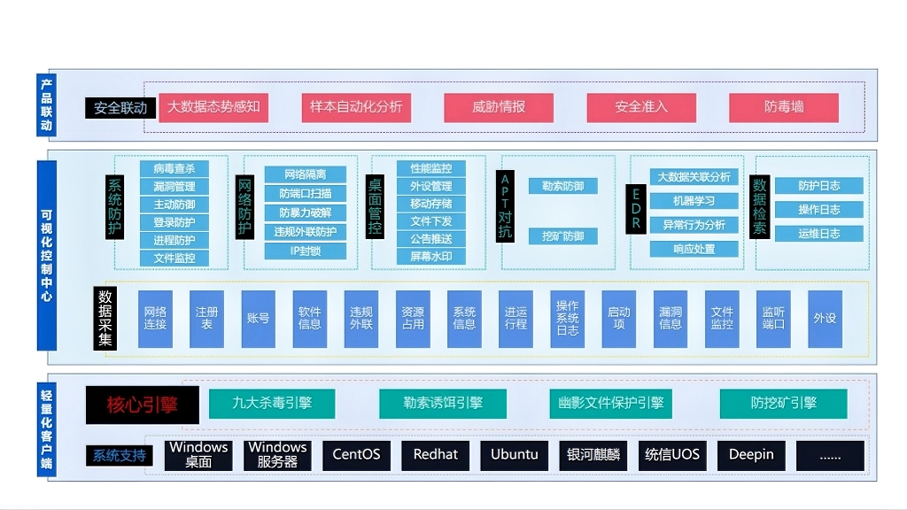該方案具備病毒查殺、漏洞修復(fù)、外設(shè)管控、信息采集、威脅檢測(cè)、處置響應(yīng)等終端安全防護(hù)能力,且采用了自主研發(fā)的“靜態(tài)+動(dòng)態(tài)”雙維度勒索&挖礦圍獵技術(shù)。解決了普通安全產(chǎn)品難以應(yīng)對(duì)終端安全事件、難以管理全生命周期的問題,可真正做到事前預(yù)警防范、事中應(yīng)急處置、事后追責(zé)溯源,完成終端安全威脅閉環(huán)。