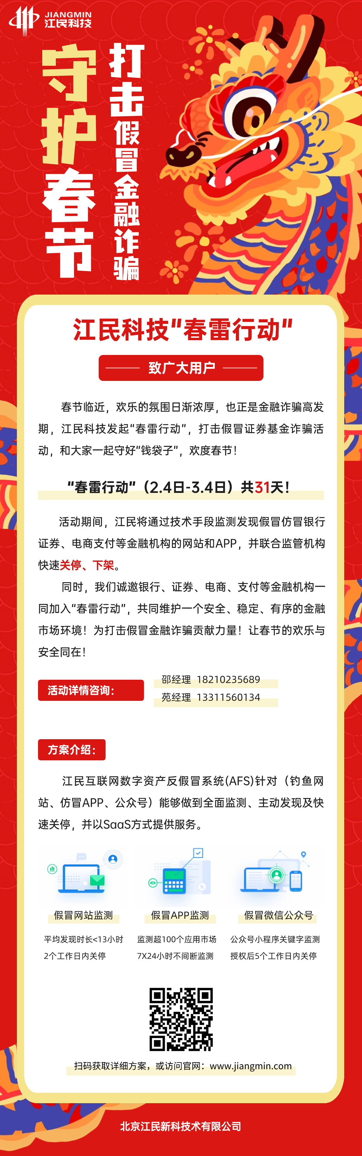近期,證監(jiān)會(huì)開展集中整治假冒證券基金經(jīng)營(yíng)機(jī)構(gòu)等詐騙活動(dòng)專項(xiàng)行動(dòng)。江民科技作為國(guó)內(nèi)知名的網(wǎng)絡(luò)安全公司、國(guó)家監(jiān)管單位突出貢獻(xiàn)支撐單位、金融網(wǎng)絡(luò)安全實(shí)驗(yàn)室首批籌建單位,