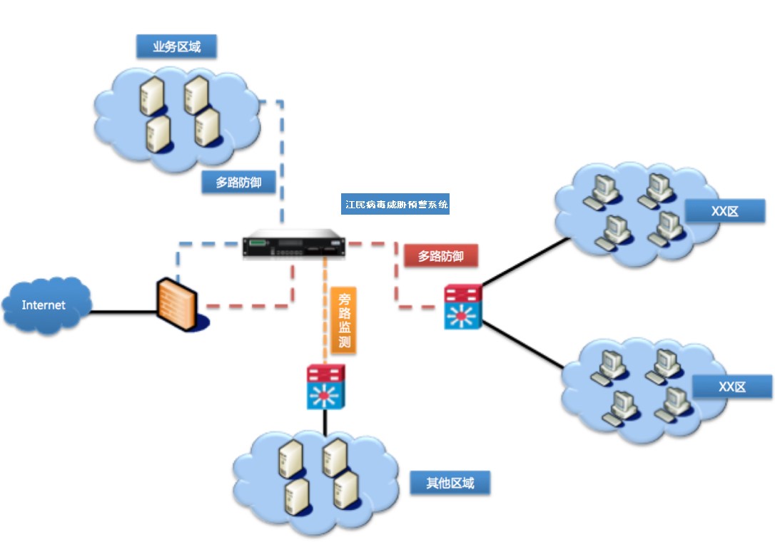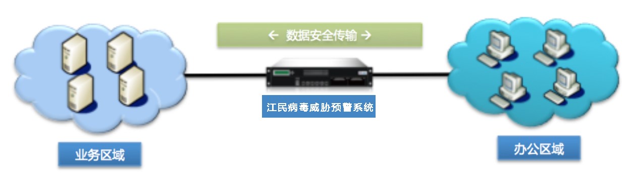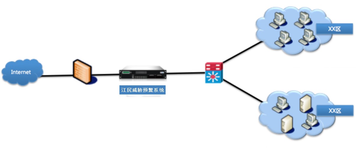 ● 部署:串行阻斷防御--江民病毒威脅預(yù)警系統(tǒng)串聯(lián)到關(guān)鍵網(wǎng)段前面。