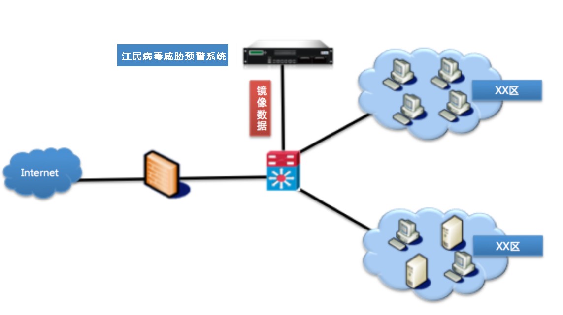 ● 部署:并行監(jiān)測部署--江民病毒威脅預(yù)警系統(tǒng)并行在網(wǎng)絡(luò)核心處