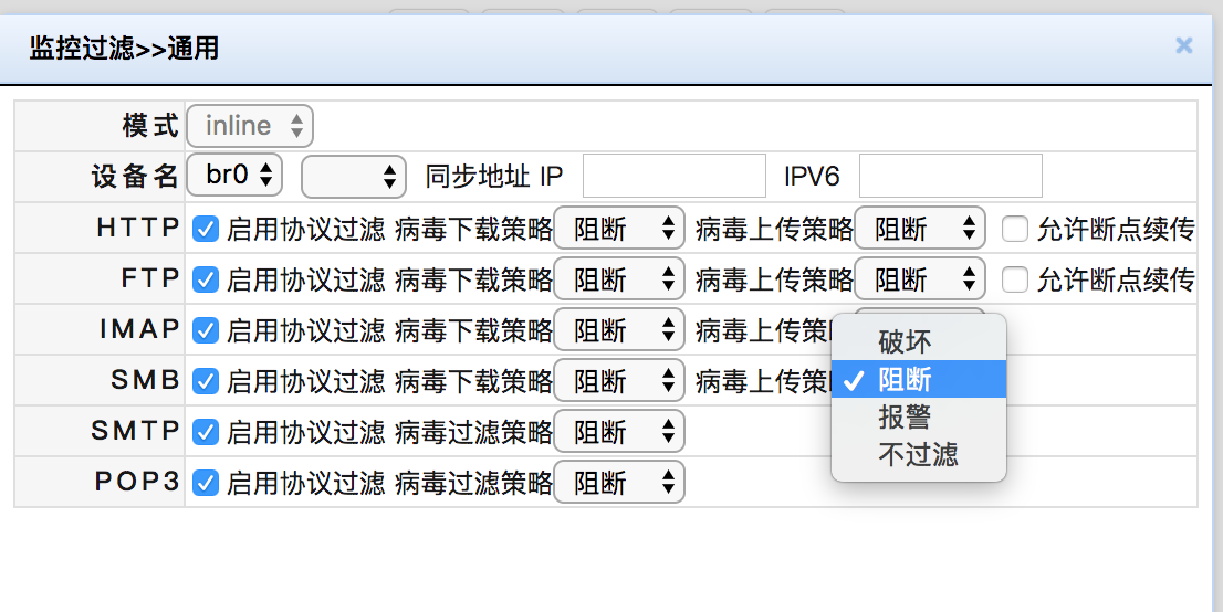 3. 開啟“監(jiān)控過濾“策略,實現(xiàn)協(xié)議層病毒過濾;