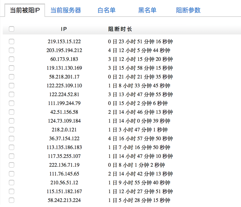 當(dāng)前被阻IP,可呈現(xiàn)外部所發(fā)起攻擊的惡意IP地址。